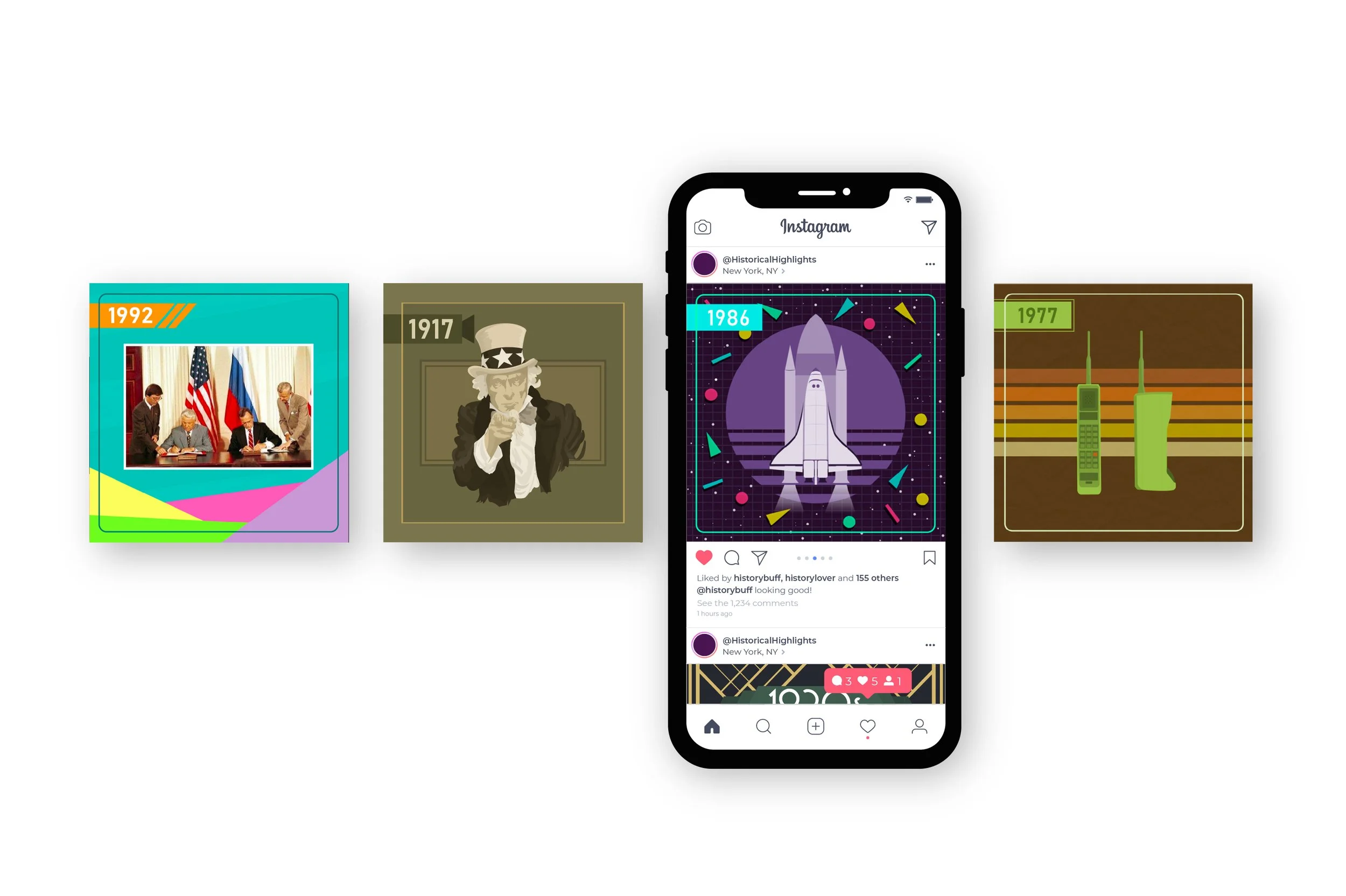 Along with creating the trivia cards, I also developed mockups of Instagram posts in addition to the trivia cards for Historical Highlights. These mockups offer a visual representation of how the project could be presented on an Instagram platform. Each post features an illustration or photo, accompanied by a notable historical fact and its corresponding year. The caption of each post is intended to provide a brief explanation of the featured fact.
