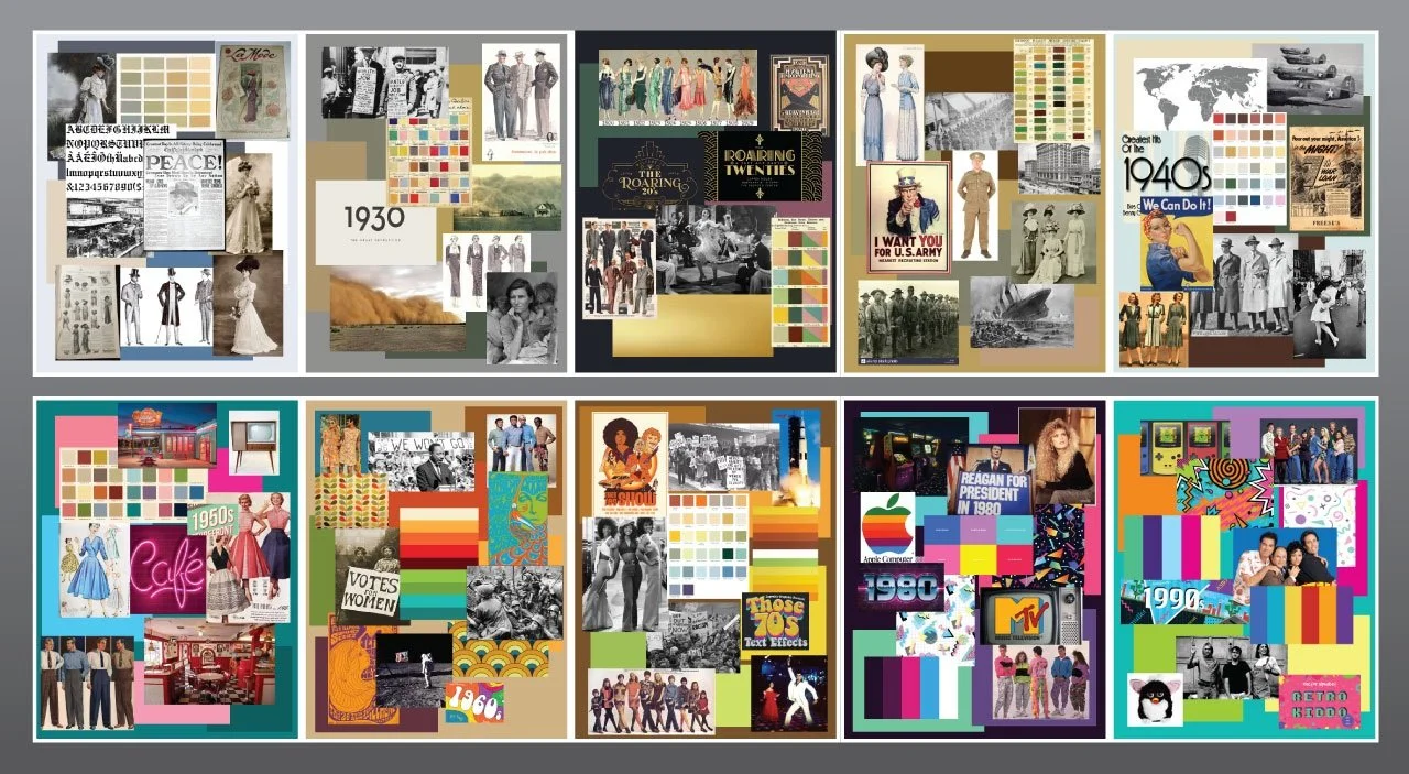 As I began my project, my focus was on crafting detailed mood boards to capture the unique essence and visual flair of each decade. While most of the mood boards stayed true to their original themes, a handful - like the 30s, 40s, and 60s - took on remarkable transformations as I unearthed more about these eras.